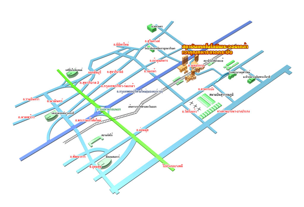 - Airport rail link to Ladkrabang station, and take a taxi or pick-up truck taxi to Phra Chom Klao Ladkrabang